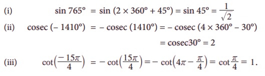 எடுத்துக்காட்டு 3.12 மதிப்பு காண்க (i) sin (765°) (ii) cosec (- 1410°) (iii) cot (- 15π/4).