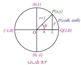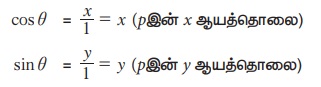 x2 + y2 = 1 என்ற சமன்பாட்டை உடைய ஓரலகு வட்டத்தைக் கருத்தில் கொள்க. θ-ன் முனைய பக்கம் ஓர் அலகு வட்டத்தின் மீது எங்குச் சந்திக்கிறதோ அப்புள்ளியை P (x, y) எனக் கொள்க.