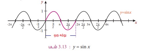 கோணத்தைக் குறிக்கும் மாறியை x என்க. கிடைமட்ட அச்சை x- அச்சாகவும், நேர்குத்து அச்சை y-அச்சாகவும் கொள்க. y = sinx என்ற சார்பின் வரைபடம் படம் 3.13 ஆகும். முதலாவதாக, 2 π இடைவெளி கொண்ட காலமுறைச் சீரமைப்பைக் காணலாம். வடிவகணித ரீதியில் இதன் பொருள் என்னவென்றால் படத்திலுள்ள வளைவரையை 2 π அளவு இடப்பக்கமாகவோ அல்லது வலப்பக்கமாகவோ நகர்த்தினால் மீண்டும் அதே வளைவரை மீது சரியாகப் பொருந்தும். இரண்டாவதாக, வரைபடம் y அச்சில் ஓரலகிற்குள் மட்டும் இருப்பதைக் கவனிக்கவும். வரைபடம் சீர் இடைவெளியில் கூடும் மற்றும் குறையும் சார்பாக உள்ளது. அதாவது - π/2லிருந்து π/2 வரை கூடும் சார்பாகவும், π/2 லிருந்து 3π/2 வரை குறையும் சார்பாகவும் உள்ளது.