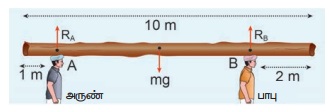 மரத்துண்டானது இயந்திரவியல் சமநிலையில் உள்ளது எனக் கொள்க. அதன்படி மரத்துண்டின் மீது நிகர விசை மற்றும் நிகர திருப்பு விசையின் மதிப்பு சுழி. புவி ஈர்ப்பு விசையானது மரத்துண்டின் நிறைமையத்தில் கீழ் நோக்கி செயல்படும். அருண் மற்றும் பாபு முறையே A மற்றும் B புள்ளிகளில் செலுத்தும் RA, RB என்ற செங்குத்து விசைகள் கீழ்நோக்கிய புவியீர்ப்பு விசையை சமன் செய்கிறது.