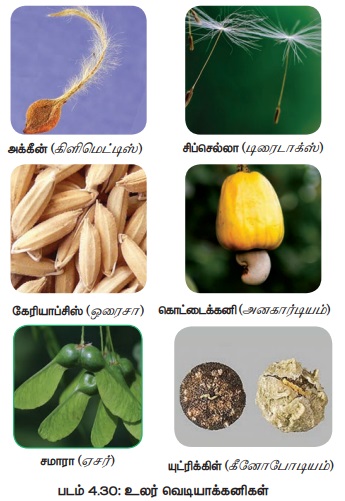 உ) சிறகுடை கனி (Samara): இது ஒரு விதை கொண்ட உலர் வெடியாக்கனியாகும். இவற்றின் மெல்லிய இறகு போன்ற அமைப்பாக மாறிக் கனியைச் சூழ்ந்து காணப்படுகிறது. எடுத்துக்காட்டு: ஏசர்.