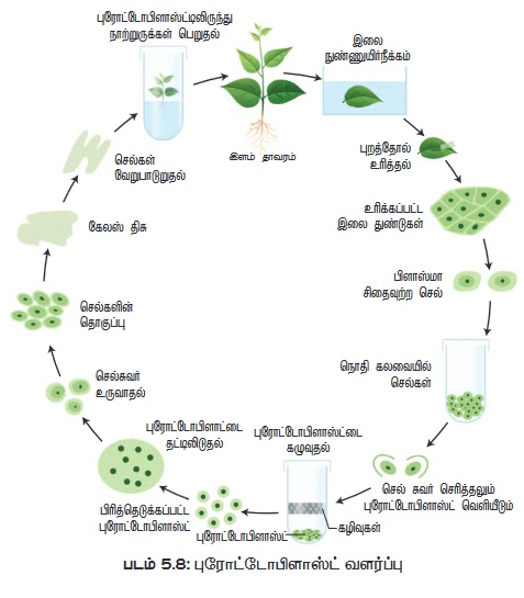 i) புரோட்டோபிளாஸ்ட்டை பிரித்தெடுத்தல்: இலைத் திசு போன்ற தாவரத்திசுவின் சிறு பகுதி புரோட்டோபிளாஸ்ட் பிரித்தெடுப்பதற்காகப் பயன்படுத்தப்படுகிறது. pH 5.4 நிலையில் 0.5% மேசரோசைம் மற்றும் 13% சார்பிட்டாலில் அல்லது மானிட்டாலில் கரைந்துள்ள 2% ஒனோசுகா செல்லுலேஸ் நொதியில் இலைத் திசுக்களின் சிறு துண்டுகளை மூழ்கி இருக்குமாறு வைக்கப்படுகிறது. இவற்றை 25°C வெப்பநிலையில் இரவு முழுவதும் வைத்துப் பிறகு மென்மையாகச் செல்களைத் தனிமைப்படுத்தும் (teasing) போது புரோட்டோபிளாஸ்ட்கள் பெறப்படுகின்றன. இவ்வாறு பெறப்பட்ட புரோட்டோபிளாஸ்ட் அதன் உயிர்ப்புத் தன்மையை நிலை நிறுத்த 20% சுக்ரோஸ் கரைசலுக்கு மாற்றப்படுகிறது. பிறகு மையவிலக்கிக்கு உட்படுத்தப்பட்டுச்செல்சுவரிலிருந்து பிரித்தெடுக்கப்பட்ட தூய புரோட்டோபிளாஸ்ட்கள் பெறப்படுகின்றன.