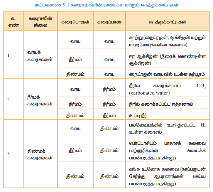 அட்டவணை 9.1 கரைசல்களின் வகைகள் மற்றும் எடுத்துக்காட்டுகள்