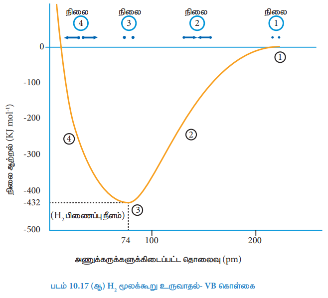 கவர்ச்சி விசையின் காரணமாக Ha மற்றும் Hb ஆகியன ஒன்றோடொன்று நெருங்குகின்றன (படம் 10.17ஆ- நிலை 2). ஆனால் அதே நேரத்தில் விலக்குவிசைகள் அவைகளை விலகலடையுமாறுச் செய்கின்றன. ஆரம்ப நிலையில், இரு ஹைட்ரஜன் அணுக்களும் ஒன்றோடொன்று நெருங்கும்போது, விலக்குவிசையினைக் காட்டிலும், கவர்ச்சி விசைகள் அதிக வலிமையுடையதாக உள்ளன. மேலும் நிலை ஆற்றல் குறைந்துக் கொண்டே வருகின்றது. ஒரு குறிப்பிட்ட நிலையை அடைந்ததும் நிகர கவர்ச்சி விசையானது விலக்கு விசைகளுக்குச் சரி சமமாகிறது. இந்நிலையில் (படம் 10.17ஆ- நிலை 3) அமைப்பானது, மிகக் குறைந்த நிலை ஆற்றலைப் பெற்றிருக்கும்.