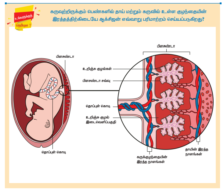 கருவுற்றிருக்கும் பெண்களில் தாய் மற்றும் கருவில் உள்ள குழந்தையின் இரத்தத்திற்கிடையே ஆக்சிஜன் எவ்வாறு பரிமாற்றம் செய்யப்படுகிறது?
