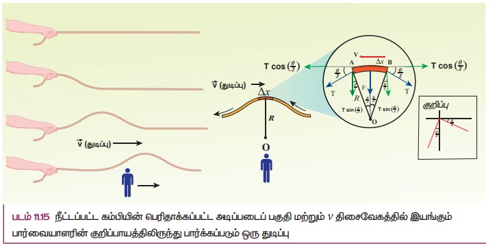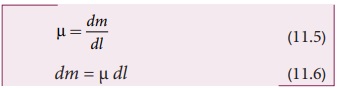 படம் 11.15 ல் காட்டியவாறு கம்பியில் ஒரு அடிப்படைப் பகுதியைக் கருதுவோம். கம்பியில் A, B என்ற புள்ளிகளை இக்கணத்தில் கருதுவோம். dI, dm என்பது கம்பியின் சிறுபகுதி நீளம் மற்றும் நிறை என்போம். வரையறையின்படி நீள் நிறை அடர்த்தி (μ) ஆனது பின்வருமாறு எழுதப்படுகிறது.