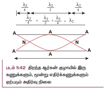 படம் 11.42 திறந்த ஆர்கன் குழாயில் ஏற்படும் இரண்டாம் நிலை அதிர்வைக் காட்டுகிறது. இது இரு கணுவையும் மூன்று எதிர்க்கணுவையும் உடையது.