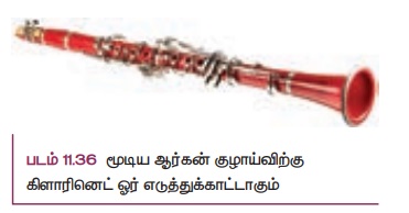 படம் 11.36. ல் காட்டப்பட்ட கிளாரினெட் படத்தை பாருங்கள். இது ஒரு பக்கம் மூடிய மற்றொரு பக்கம் திறந்த குழாய், திறந்த முனை வழியாக வரும் ஒலி, மூடிய பகுதியில் எதிரொலிக்கும் ஒலி உள்ளே வரும் ஒலியுடன் 180° எதிர்கட்டத்தில் இருக்கும். எனவே, மூடிய பகுதியில் துகள்களின் இடப்பெயர்ச்சி எப்பொழுதும் சுழி. இடப்பெயர்ச்சி சுழியாவதால் மூடிய பகுதியில் கணுவும். திறந்த பகுதியில் எதிர்க்கணுவும் ஏற்படுகின்றன. அதிர்வுறும் அதிர்வு ஒலியின் எளிய அதிர்வு நிலையை அடிப்படை அதிர்வு நிலை என்போம். மூடிய முனையில் துகள்களின் இயக்கம் இல்லாததால் கணுவும் அடிப்படை அதிர்வு நிலையில் திறந்த முனையில் எதிர்க்க ணுவும் உருவாகும். படம் 11.37 ல், L குழாயின் நீளம், ஏற்படும்.