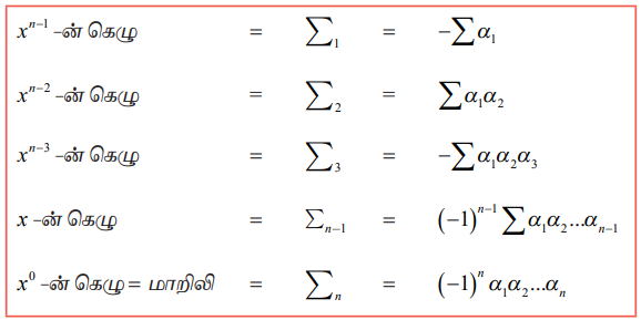 xn – (∑ α1)xn−1 + (∑ α1 α2 )xn−2 − (∑ α1 α2 α3)xn−3 +... + (−1)n α1α2 … αn = 0 என எழுதலாம்.