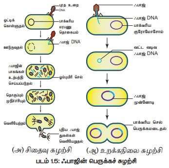 இரண்டு வெவ்வேறு வகையான வாழ்க்கைச் சுழற்சிகள் மூலம் ஃபாஜ்கள் பெருக்கமடைகின்றன. (அ) சிதைவு அல்லது வீரியமுள்ள சுழற்சி (ஆ) உறக்கநிலை அல்லது வீரியமற்ற சுழற்சி.