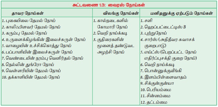 வைரஸ்கள் தாவரங்களிலும், விலங்குகளிலும், மனிதர்களிலும் நோய்களை ஏற்படுத்துகின்றன. சில நோய்களின் படங்கள் படம் 1.6-ல் கொடுக்கப்பட்டுள்ளன. வைரஸ் நோய்களின் பட்டியல் அட்டவணை 1.3 -ல் கொடுக்கப்பட்டுள்ளது.