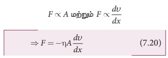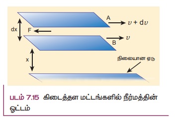 ஒரு நிலையான கிடைமட்ட ஏட்டின் மீது ஒரு திரவம் சீராகப் பாய்வதாகக் கொள்க (படம் 7.15) ஒரு நிலையான ஏட்டில் இருந்து தொலைவாகச் சென்றால் ஏடுகளின் வேகங்கள் சீராக அதிகரிக்கிறது. A மற்றும் B என்ற இரு இணையான ஏடுகளைக் கருதுக. நிலையான ஏட்டிலிருந்து x மற்றும் x + dx தொலைவில் அருகாமையில் உள்ள ஏடுகளின் திசைவேகங்கள் முறையே v மற்றும் v + dv எனக் கொள்க.