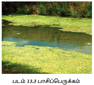 3. நீர் மாசுபாட்டினால் விளையும் ஊட்டச் செறிவு, மிகை உணவூட்டத்திற்குக் (Eutrophication) காரணமாகிறது. இதனால் ஏற்படும் பாசிப்பெருக்கம் நீர் நிலைகளின் தரத்தினைப் பாதிக்கிறது (படம் 13.3). சிவப்பு அலைகள் காணப்படுமேயானால் நீர் வாழ் விலங்குகளில் இறப்பினை ஏற்படுத்தும்.