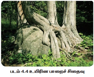 சிதைவு என்கிறோம். காலநிலை, தாவரங்கள், விலங்குகள் மற்றும் பிற உயிரிகளால் பாறைகளானது