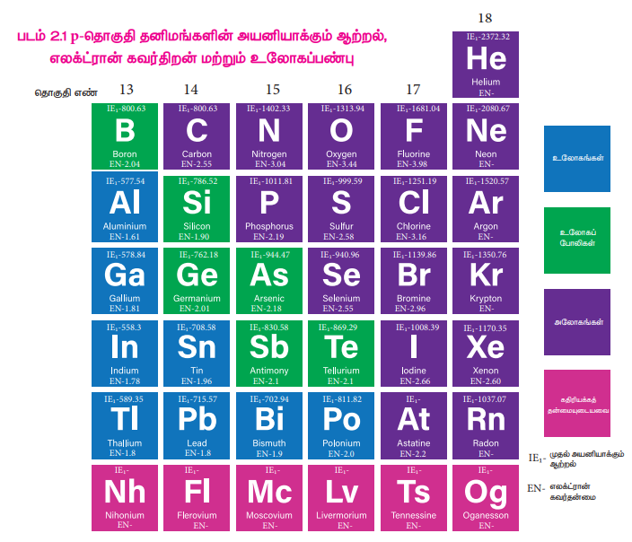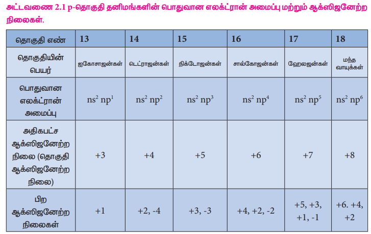 * p-தொகுதி தனிமங்களின் பண்புகளில் காணப்படும் பொதுவான போக்கினை விவரித்தல்,